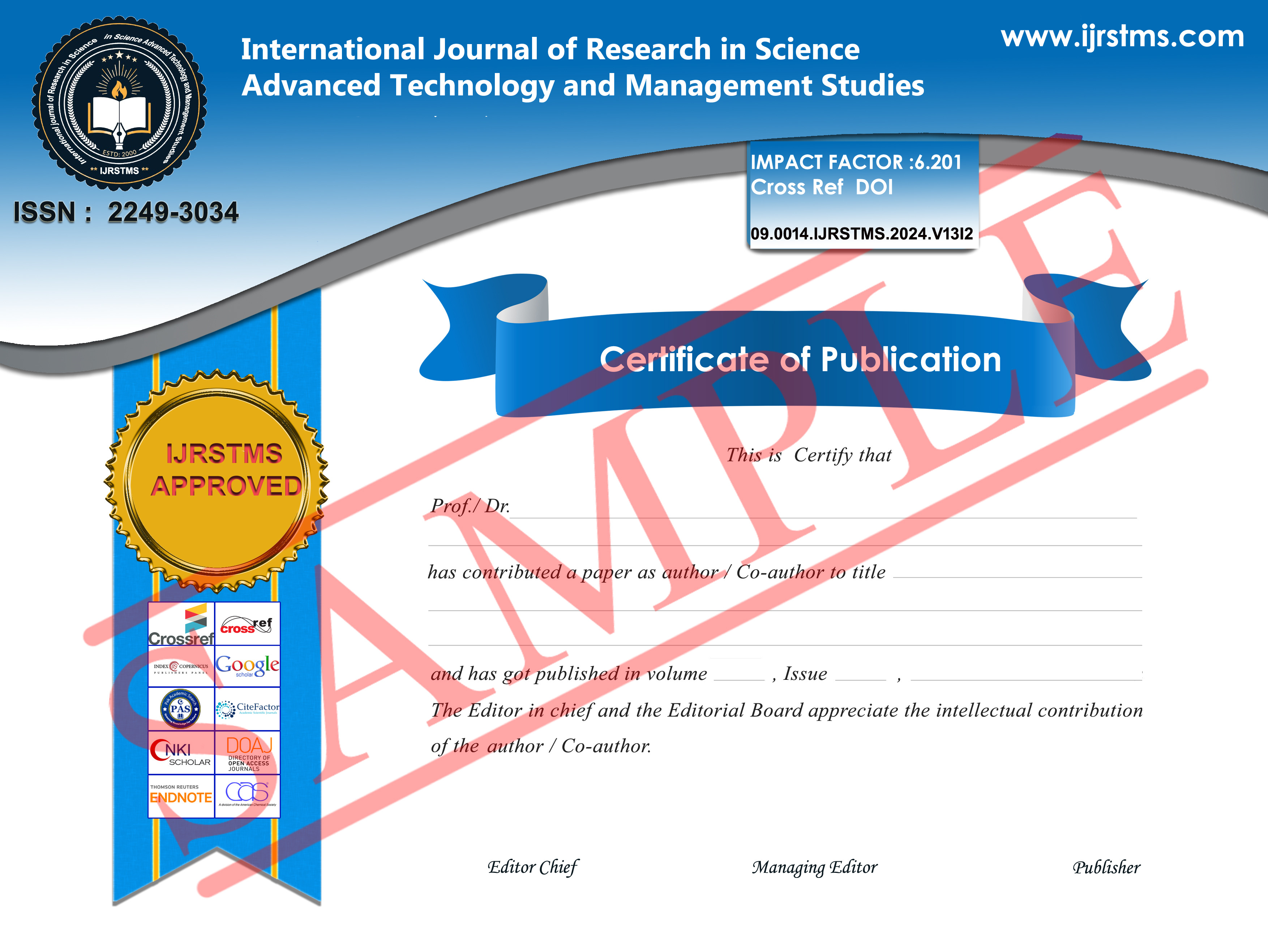 International Journal of Research in Science Advanced Technology and Management Studies is an open access journal, which means that all articles are available on the internet to all users immediately upon publication. Non-commercial use and distribution in any medium is permitted, provided the author and the journal are properly credited. Benefits of open access for authors include: free access for all users worldwide, authors retain copyright to their work, increased visibility and readership, rapid publication, no spatial constraints. Special issues dedicated to international conferences in the topics of the journal are brought out, as well. All submitted manuscripts are initially evaluated by the Editor and, if are found suitable, are sent for further consideration, to peer reviewers for an independent and anonymous expert review process.